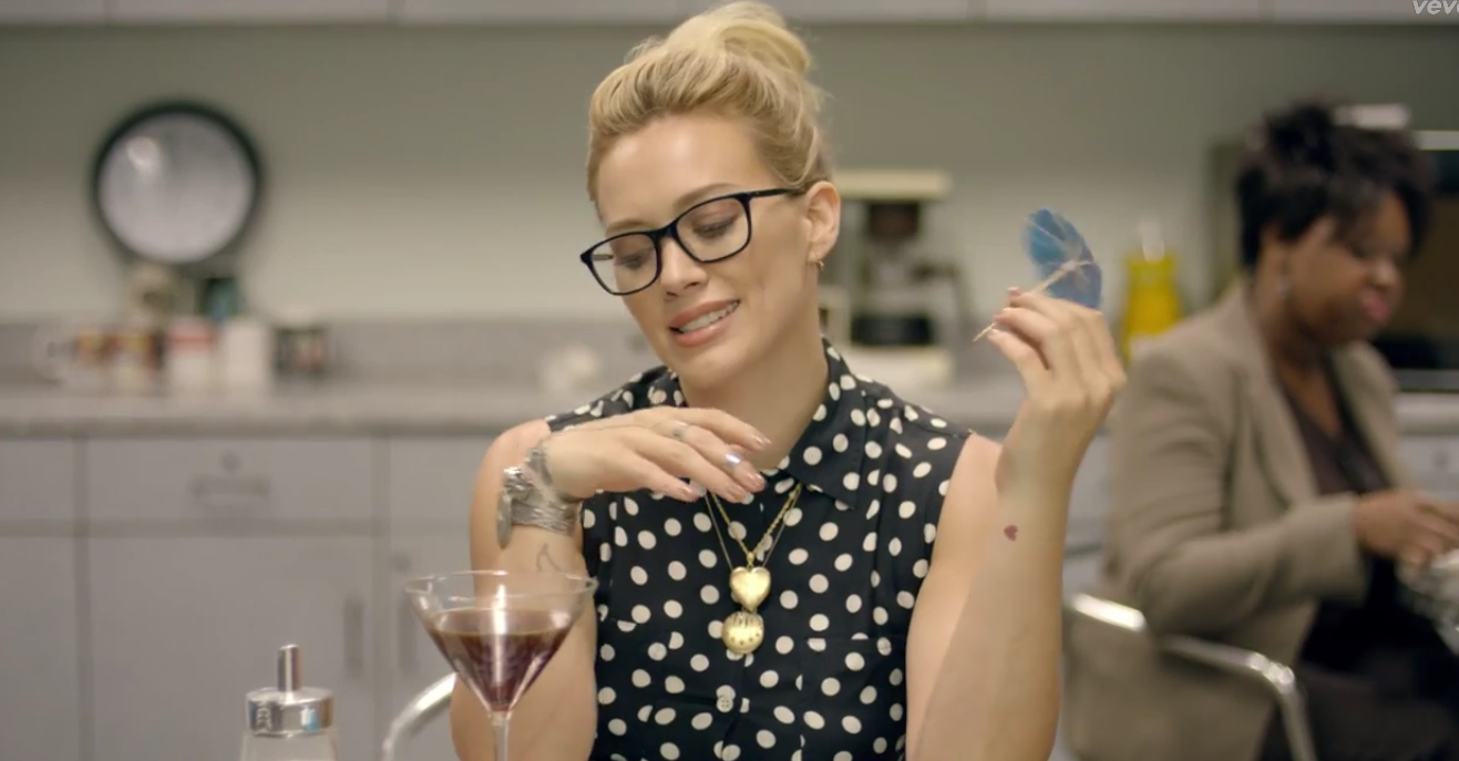 Seven years brings us to a overworked and unimpressed Hilary Duff as she lugs over to her cubicle at work. Her hair is up in a bun, rimmed-nerd glasses are on, and she wears a cute black and white polka dot blouse.