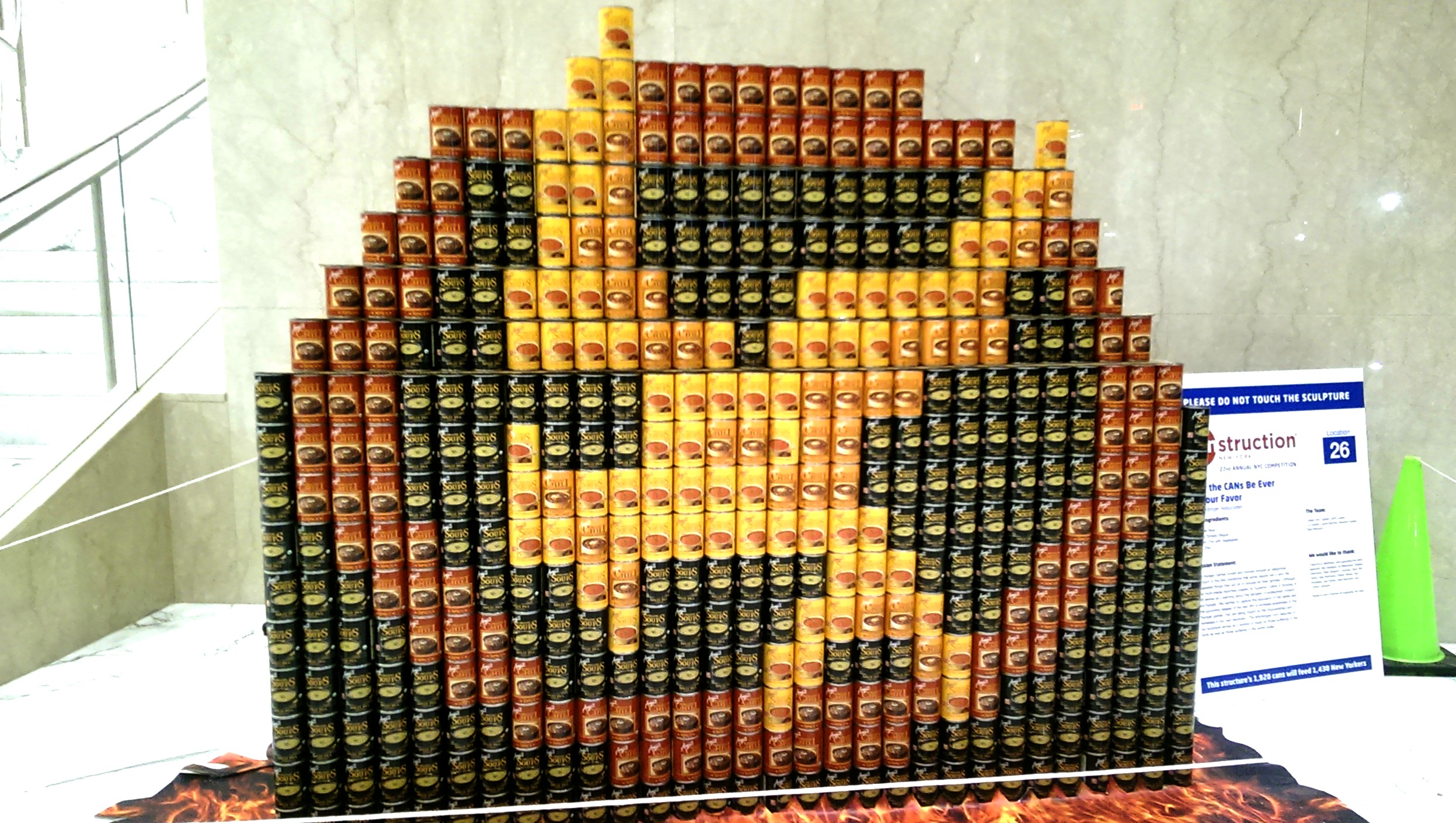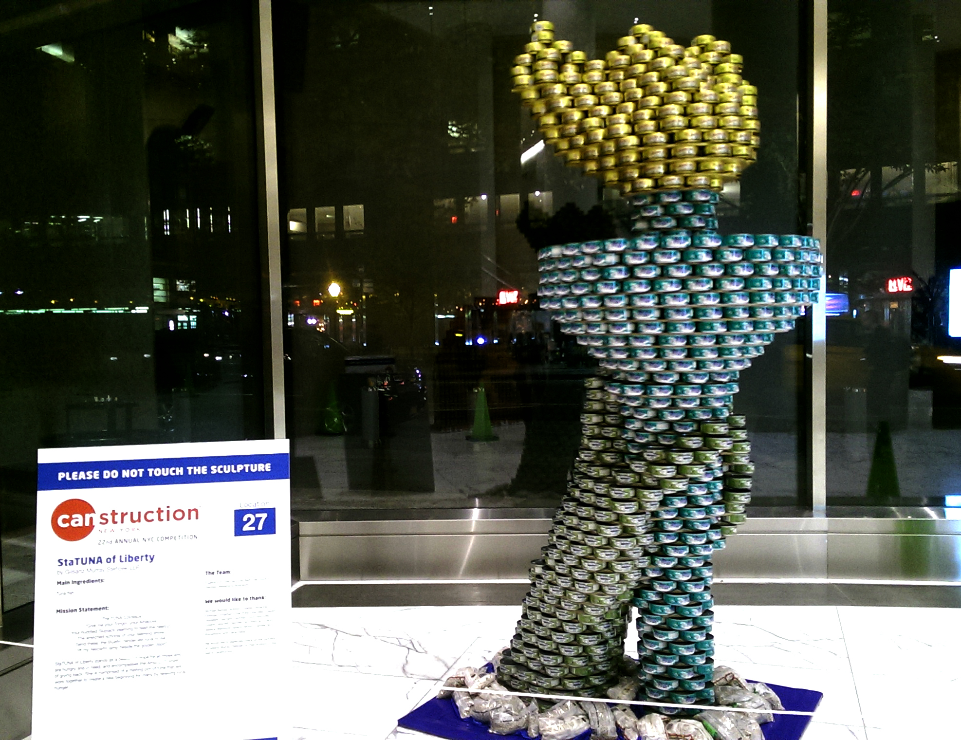 The CANstruction exhibit at Brookfield Place in NYC is a display of can art sculptures created by artists who entered the food charity competition this year. The food charity competition is held every year, and this particular exhibit is open until November 20th.