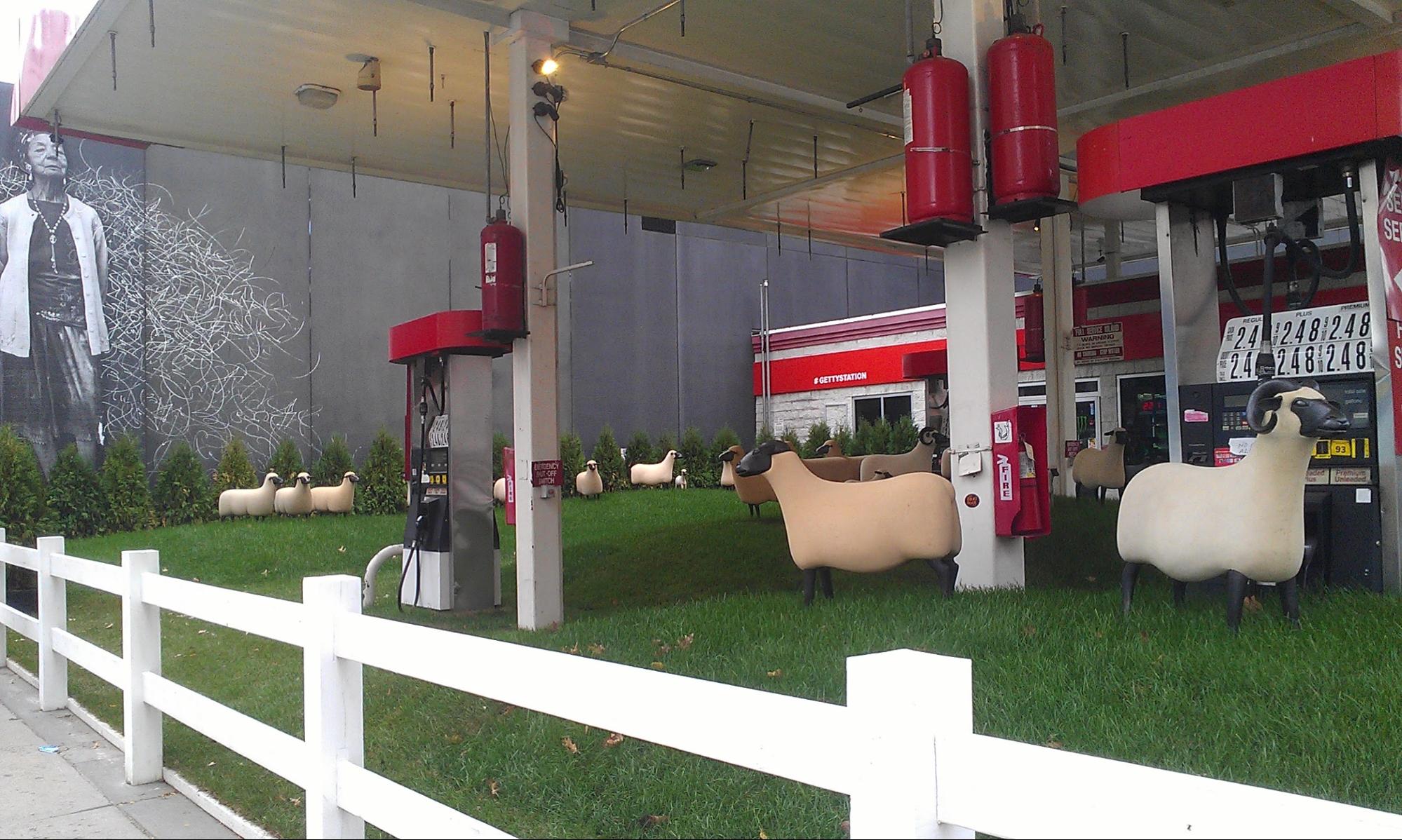 The exhibit is called Getty Station, a public art project presented by Michael Shvo and Paul Kasmin Gallery, which features the “moutons” (French for “sheep”) from late artist François-Xavier Lalanne’s Moutons de Laine.