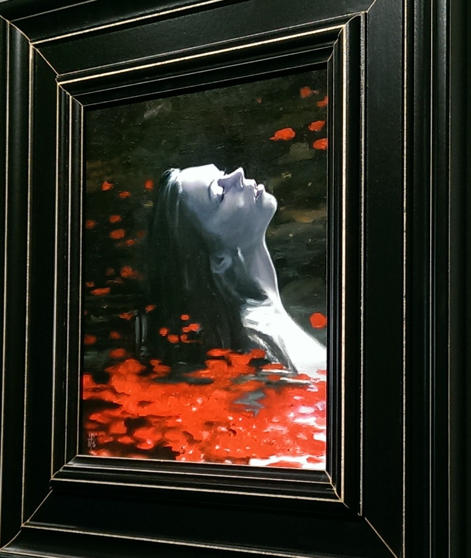 The painting is called Rise, and the red color he uses for the flowers in the water give the scene a sort of passionate nature. From the woman’s pose to the way her hair blends into the water, this painting is just simply gorgeous.