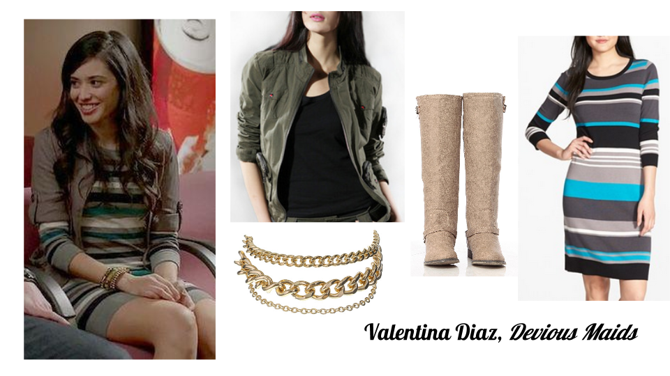 You might feel like wearing a dress to school, but how do you pull it off without looking too done-up? Devious maid Valentina Diaz tones her sweater dress down with a cargo jacket, turning a business casual look into sporty chic. Add a pair of boots and some jewelry for a polished look.