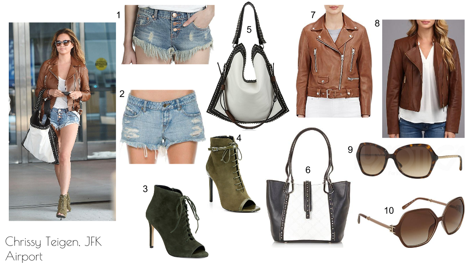 However, Chrissy Teigen looks like a BAMF sans makeup in these hexagon sunglasses, brown leather jacket, and studded bag. I can’t even pull off wearing black with brown, and she was bold enough add not only the black but the white to this color scheme.