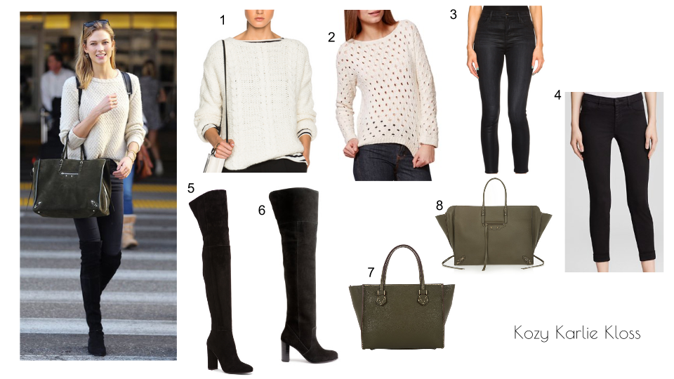 Karlie Kloss is rocking a super cute ballet knit sweater with suede thigh high boots and an olive green tote. I love the subtle pop of color she adds to the outfit with the olive green bag, keeping things on the neutral side.
