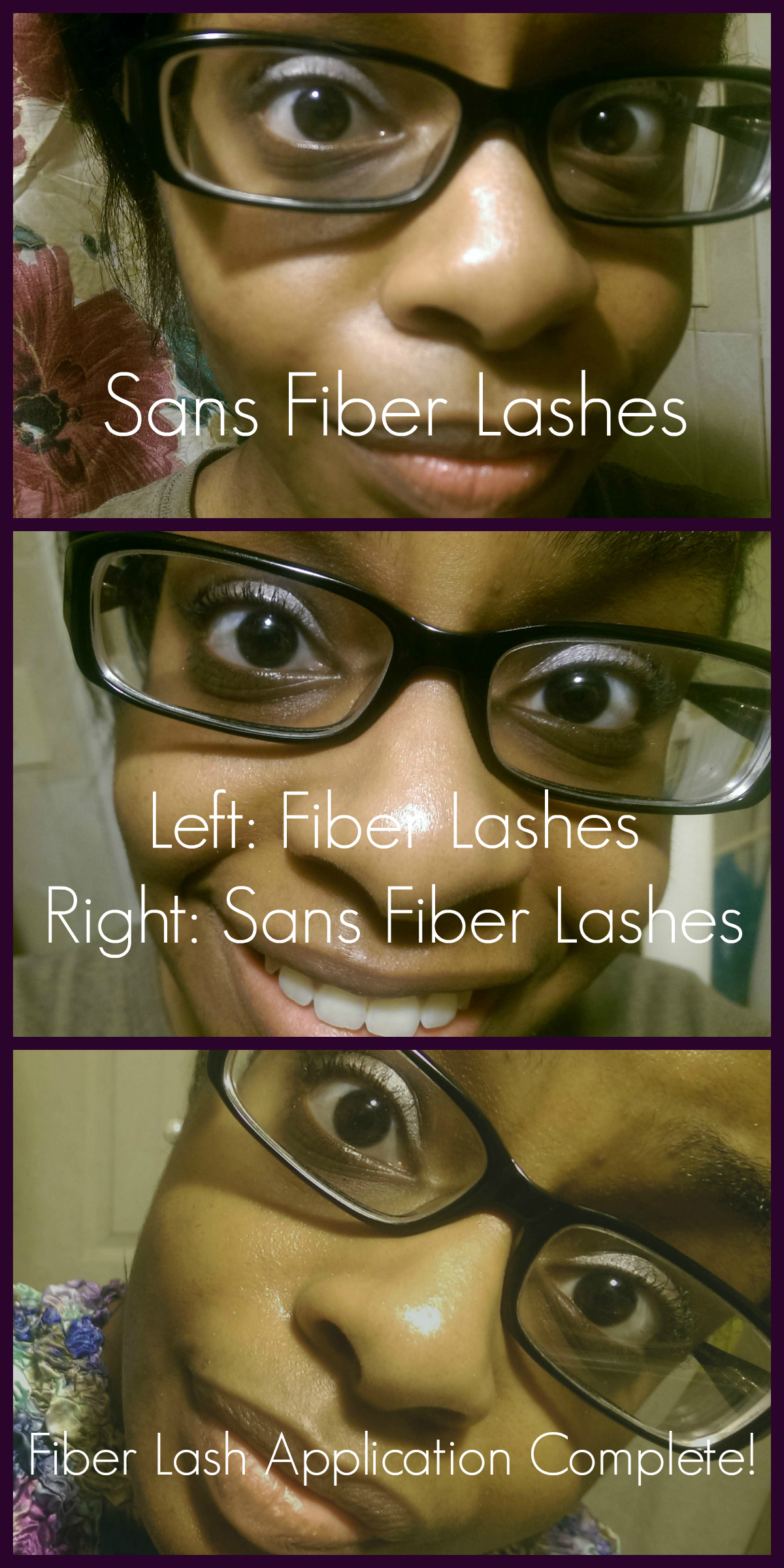 Puedes ver en el collage de arriba cómo mis pestañas se ven antes de aplicar las fibras, sin las fibras en el ojo derecho, y cuando terminé la aplicación de ambos ojos.