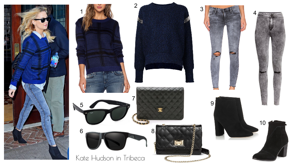 Kate Hudson stepped out of her hotel in Tribeca on Monday wearing this cozy looking deep blue plaid sweater with smoky gray ripped jeans and suede ankle boots. Very casual and very mid-fall appropriate, don’t you think?