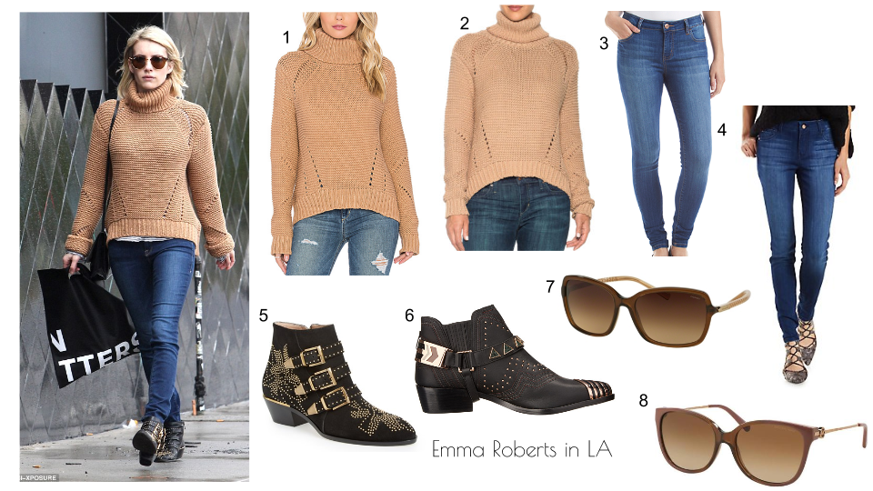 Emma Roberts looked extra cozy in LA last week in a tan-colored chunky turtle neck cable knit sweater, blue jeans, gold studded booties, and brown sunglasses.