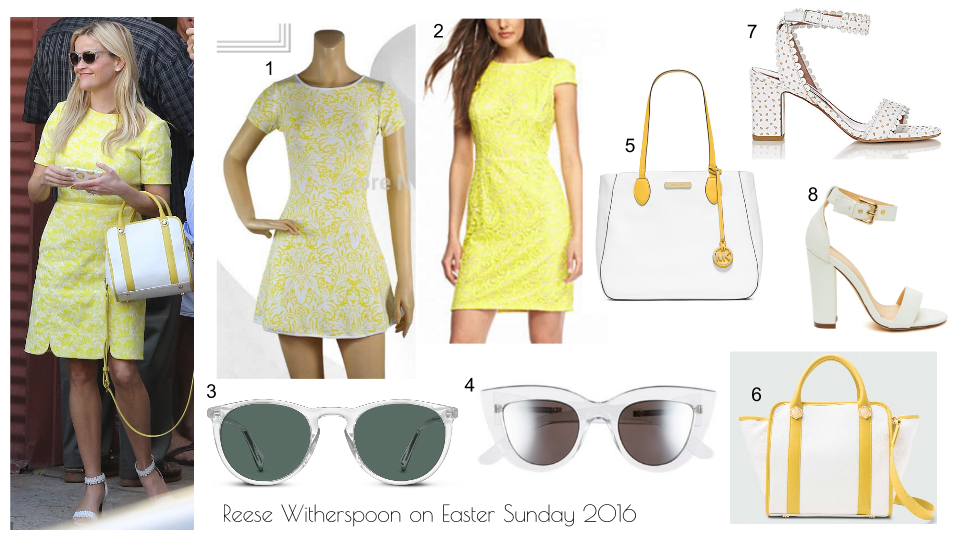 On Easter Sunday 2016, Reese wore one of her yellow jacquard dresses from Draper James. She paired it with a bright yellow and white handbag, chunky white sandals, and clear framed sunglasses.