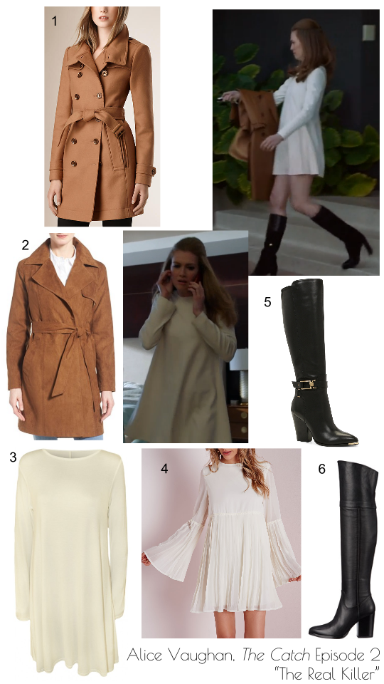 In episode 2, titled “The Real Killer,” Alice wears a white swing dress with tall black boots. As she leaves the house, she’s seen with a tan-colored trench coat hanging over her arm.
