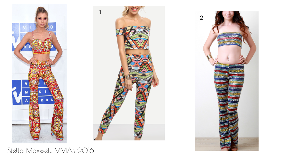 But anyway, for this week’s Wardrobe Wednesdays, we’re saying goodbye to the summer with splash of color from Stella Maxwell’s 2-piece tribal print set. I don’t know why the critics are listing her as one of the worst dressed. I just love the flared pant leg!