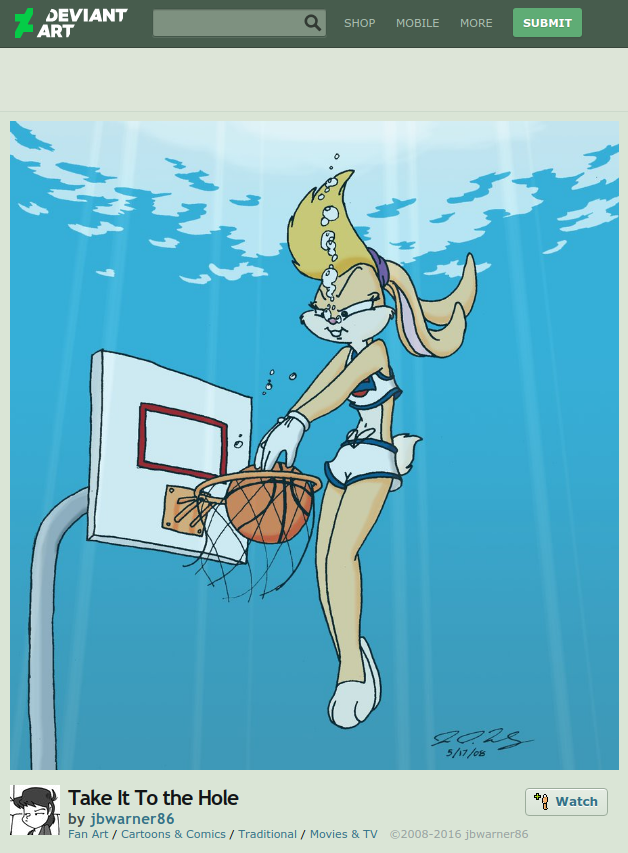 Called “Take It To the Hole,” Jessie J. Barboza (jbwarner) puts Lola Bunny in an underwater scene for his Underwater Babes of Toontown series. The expression on Lola Bunny’s face in the cartoon definitely makes this an intriguing piece of fan art. Why does she look so unimpressed while making this shot?