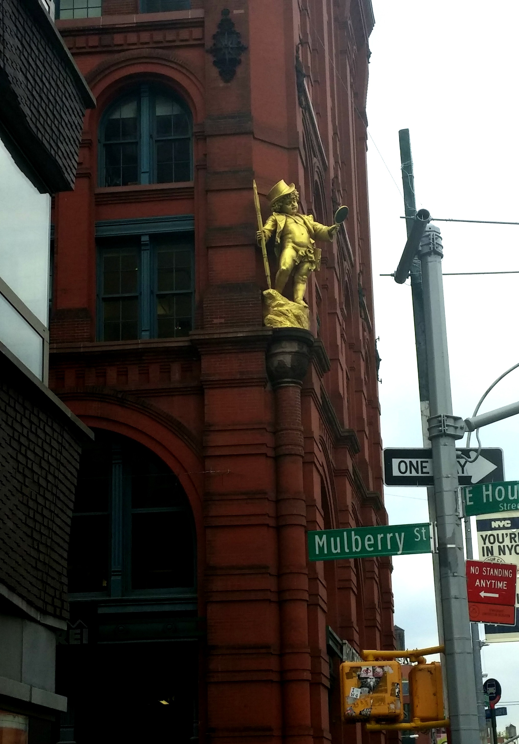 Back in September, I was walking through NoLIta after buying tickets for a show at Mercury Lounge when I saw this golden statue on the Puck Building, known as the home of retail store REI.