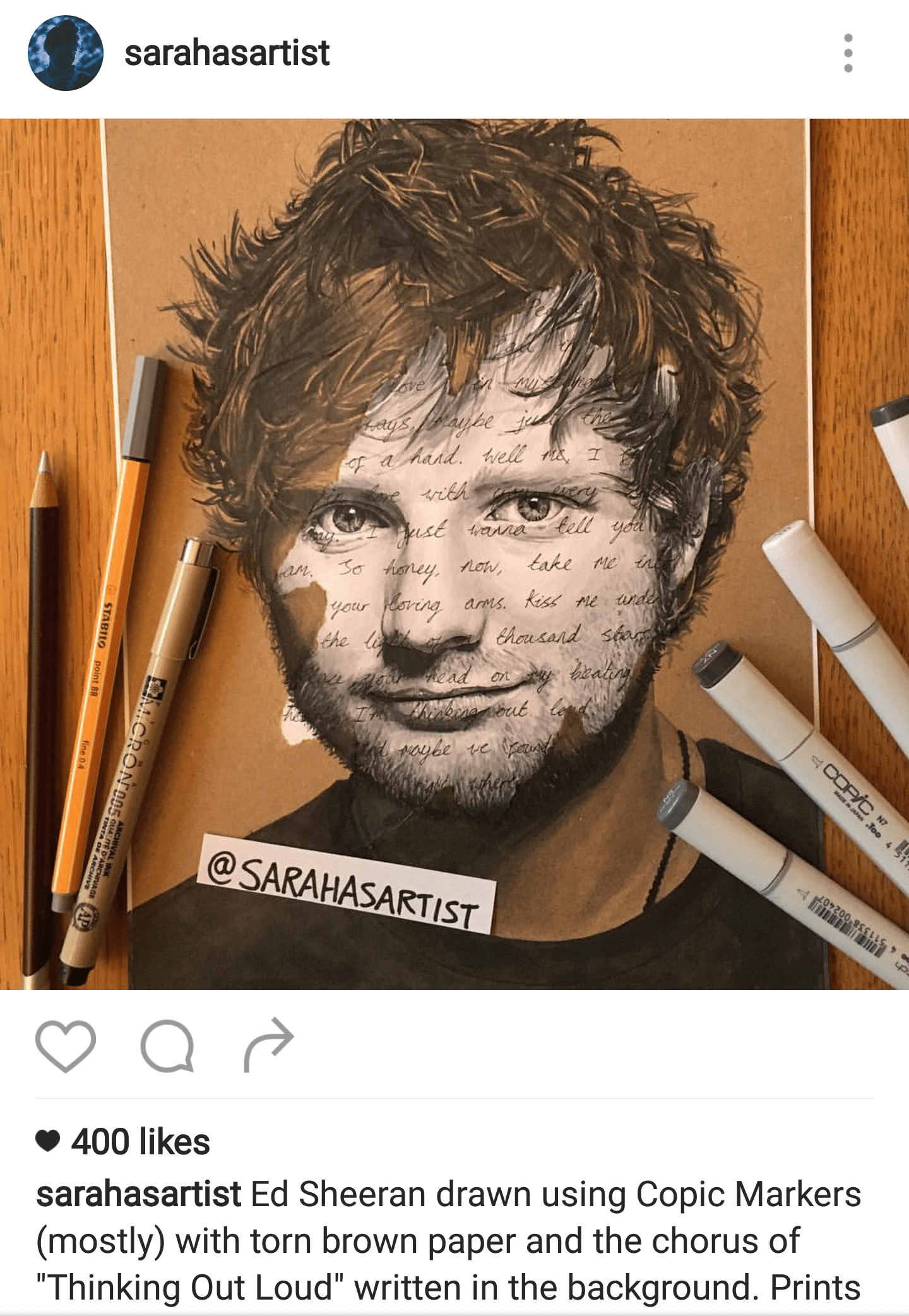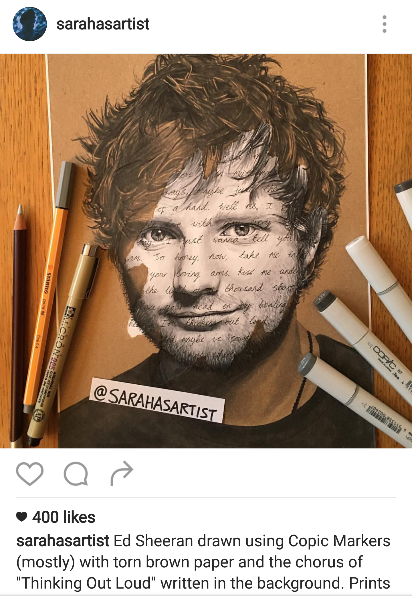 While snooping around Instagram, I came across this really creative fan art of Ed Sheeran by sarahasartist. Drawn on brown paper, the chorus of “Thinking Out Loud” dances across his slight grin. It’s the perfect transition from x to ÷.