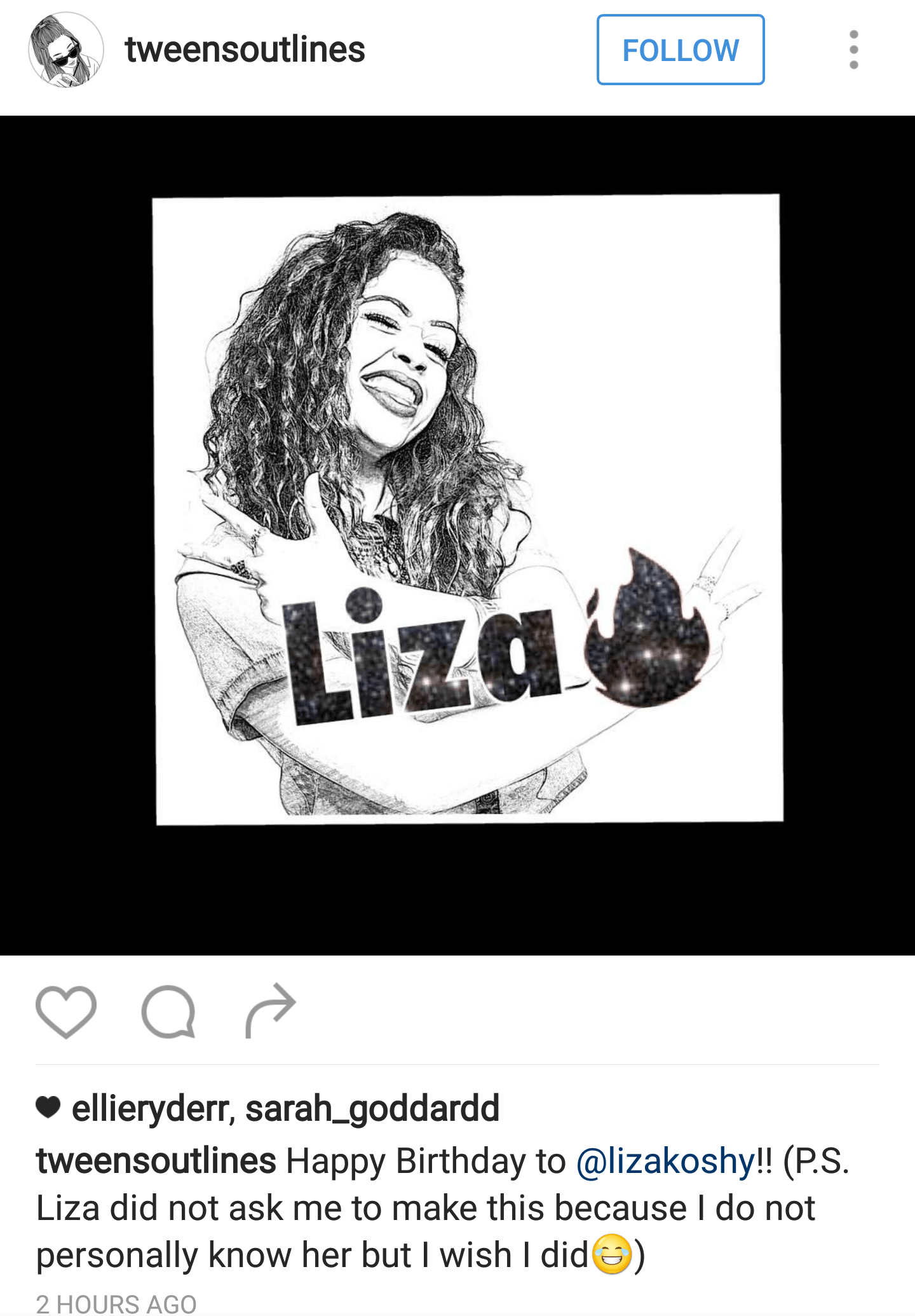 To celebrate Liza today, I’m featuring this really cool outline I found on Instagram by tweensoutlines. It was created using Liza’s current YouTube icon. If you’d like her to make one of you, head over to instagram.com/tweensoutlines for instructions in the bio!