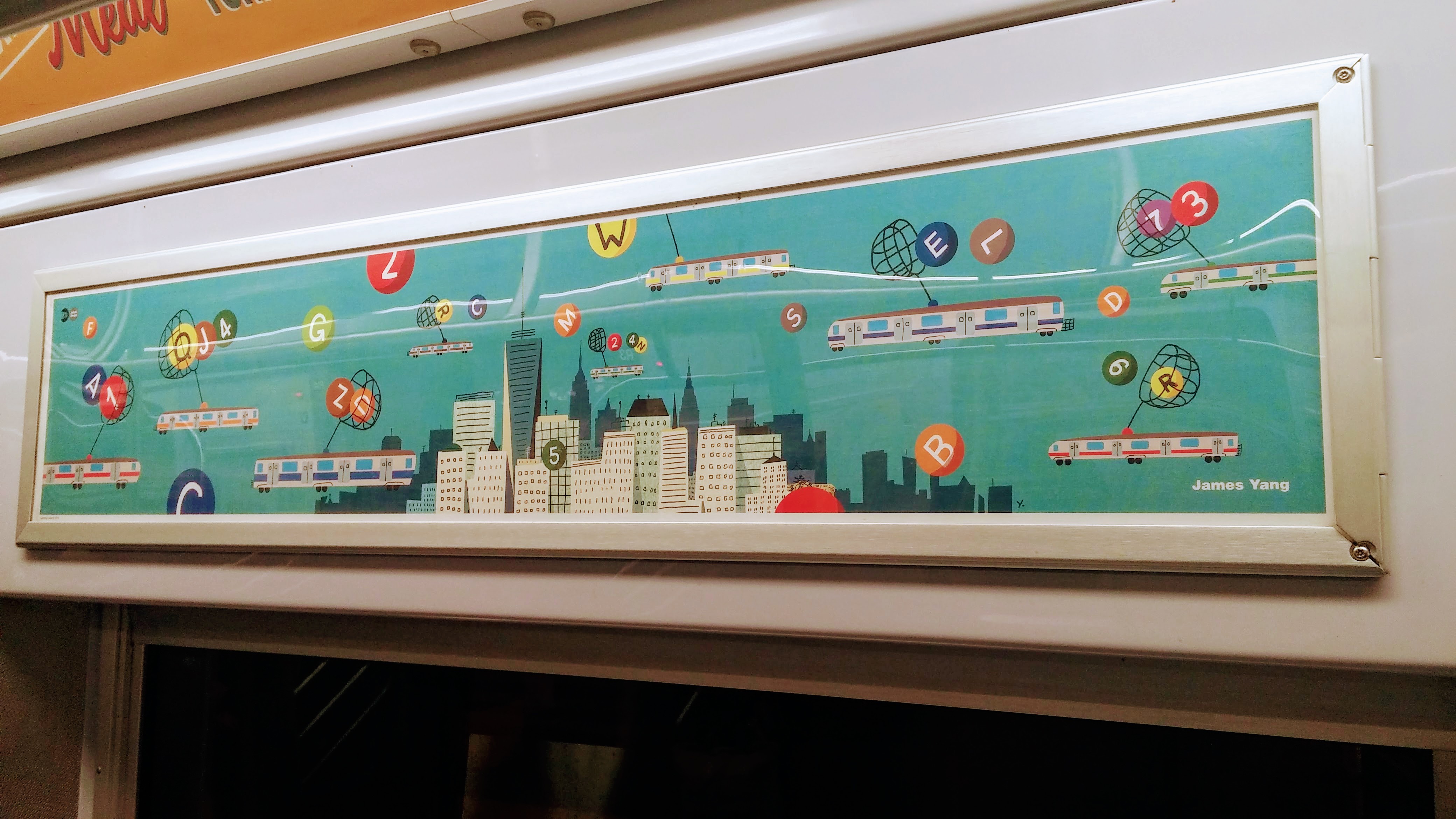 I saw this MTA subway art card for the first time back in March, and have continued to see it on various trains since then. Called “Catching Lines,” the piece was created by Brooklyn-based artist James Yang.