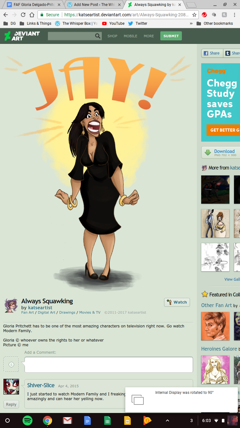 Gloria is also known for being really loud, as portrayed in this fan art by katseartist on Deviant Art. She’s screaming for her husband, Jay, as she does regularly on the show. I can hear her voice just from looking at this cartoon version of Gloria.