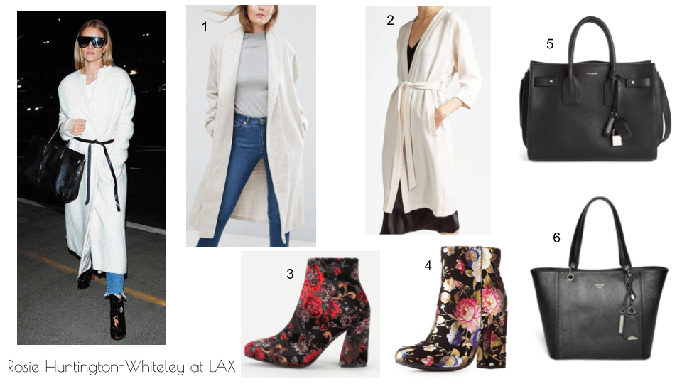 Model Rosie Huntington-Whiteley was spotted this week at LAX rocking the most amazing pair of velvet ankle booties I’ve ever seen! The velvet booties were black with a vibrant floral print. She paired the boots with a cozy white wrap coat and a black designer tote bag.