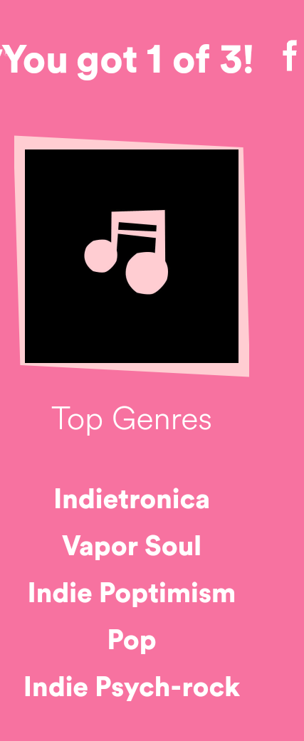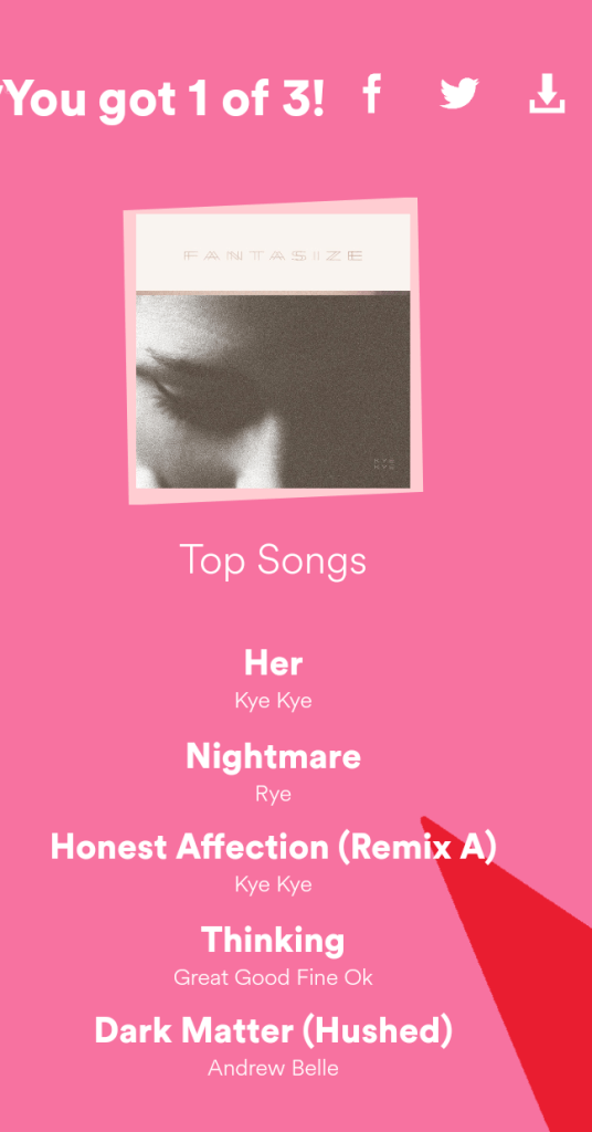 Now they’re going over the top to bring you measly top fives in categories like genre and such. You’re presented with a mini quiz where you guess your most played artists, song, and etc. before they give you the actual results. What gives?