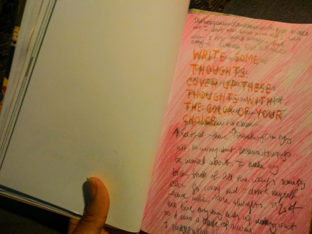 For this page, I was prompted to write down some thoughts and color on top of them. I’m assuming the color was supposed to make the thoughts unreadable, and therefore private, but we all know I can’t press down hard while shading. I wrote really sloppy anyway, so I doubt anyone will be able to tell what was actually written. I wrote in pencil, and the color I chose to cover this page with is pink, but it looks a bit red in the photo.