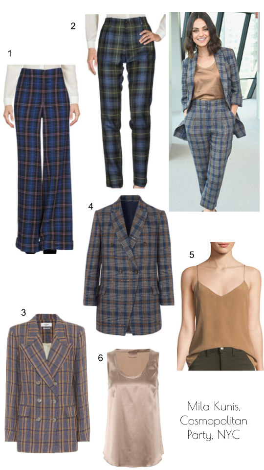 Mila Kunis attended a Cosmopolitan party in New York City celebrating her cover last week in this amazing plaid ensemble. She wore a matching blazer and pant with blue and brown hues, sporting a tan-colored tank underneath.