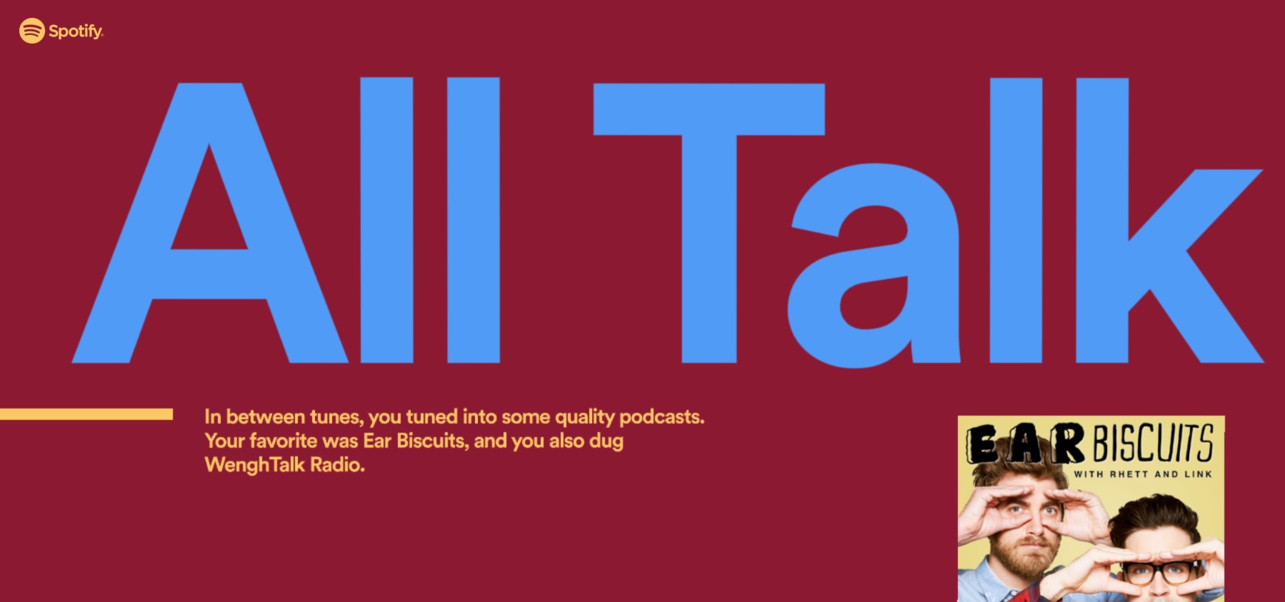I’m really loving the podcasts section of Spotify these days. Ear Biscuits and WenghTalk Radio are among my faves this year, as are We Watch Food and Subway Creatures!