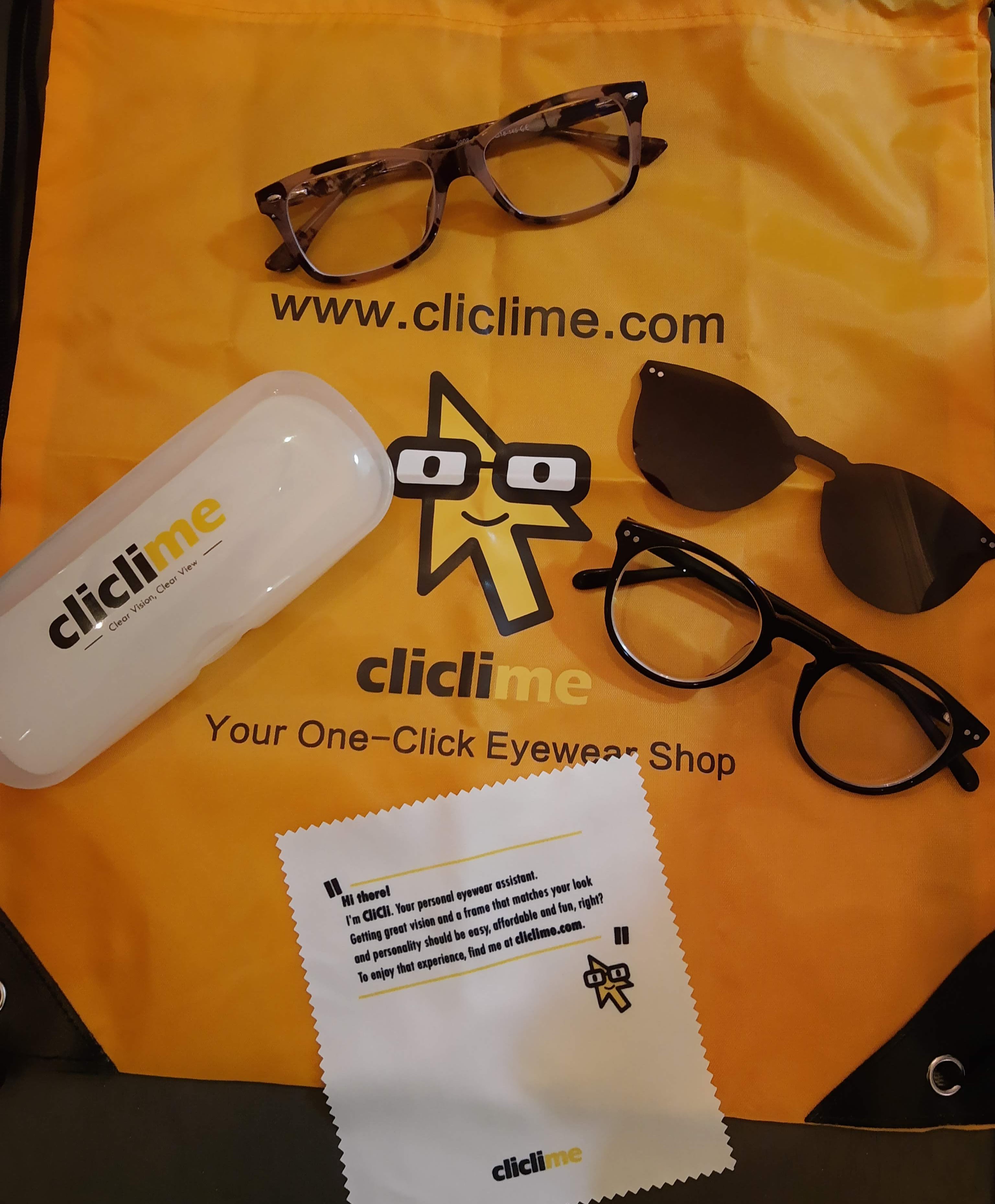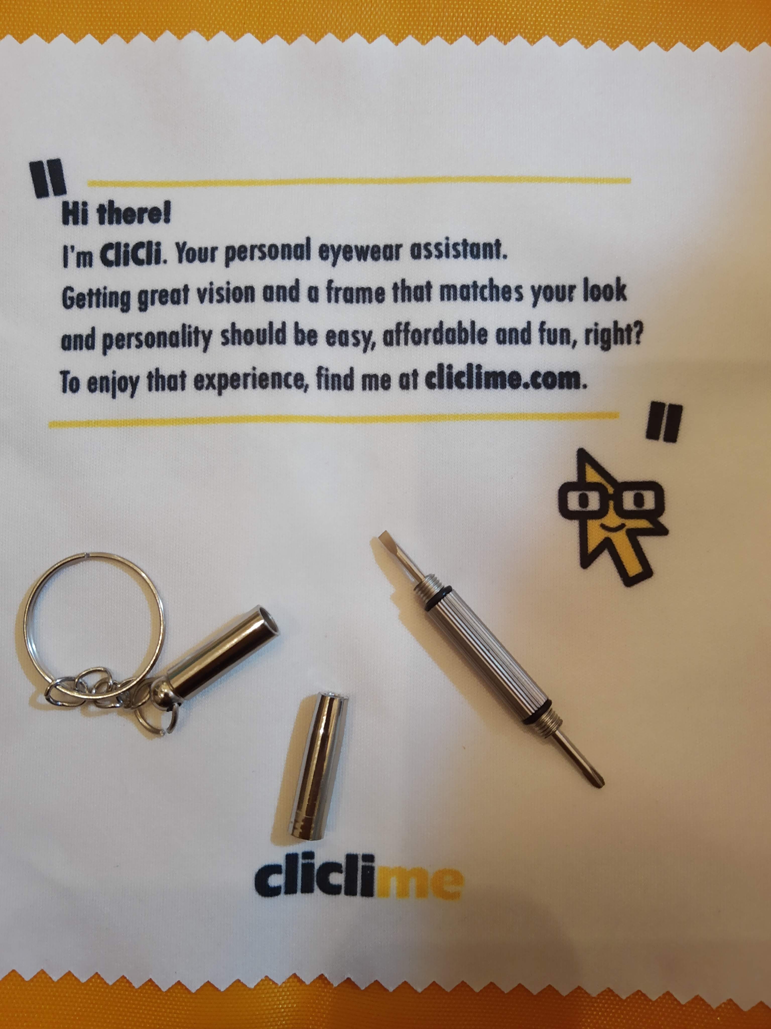 My two pairs of glasses came with an orange Cliclime drawstring bag, glasses cases, lens cloths and a double-sided tool to tighten the screws on the frames.