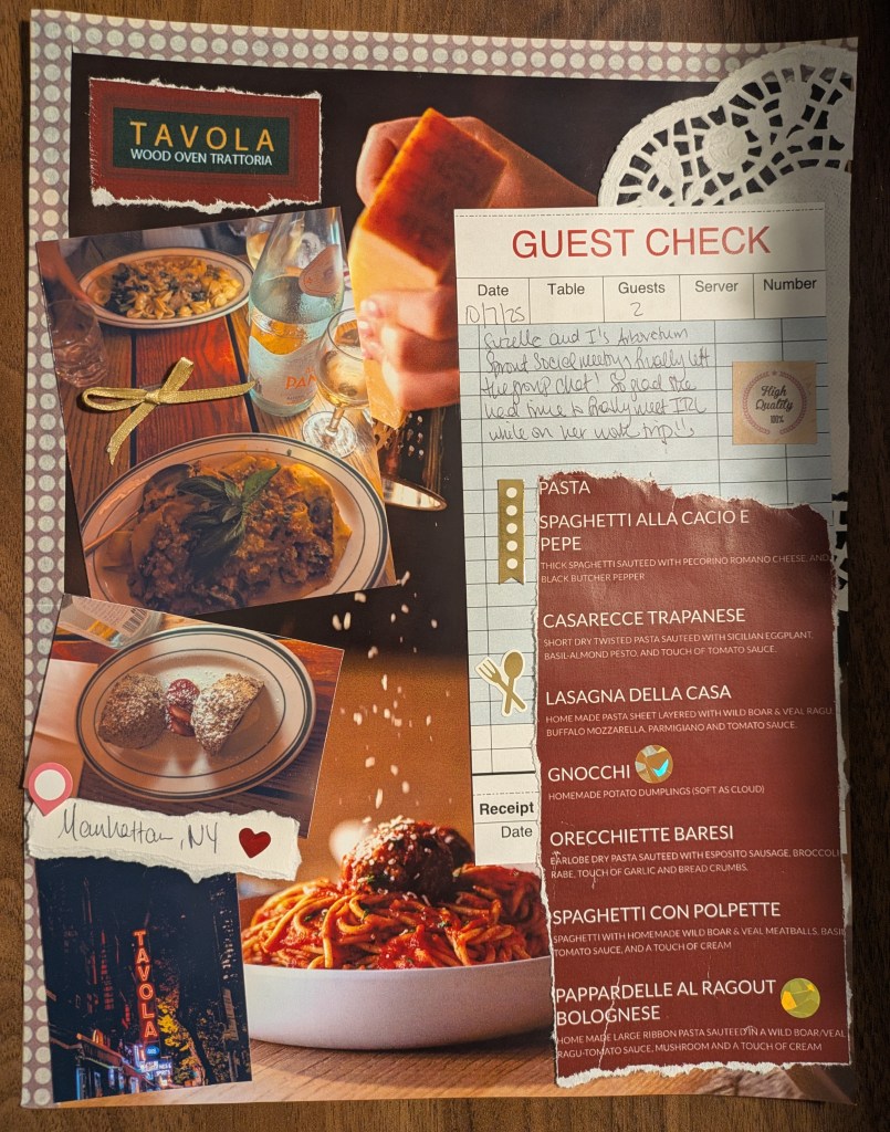 I didn’t have much junk from the restaurant and we forgot to take a pic together, so I used a printable guest check, a print out of the menu, some photos of the food and an old DeCicco’s catering magazine page of a person grating cheese over pasta for the spread.
