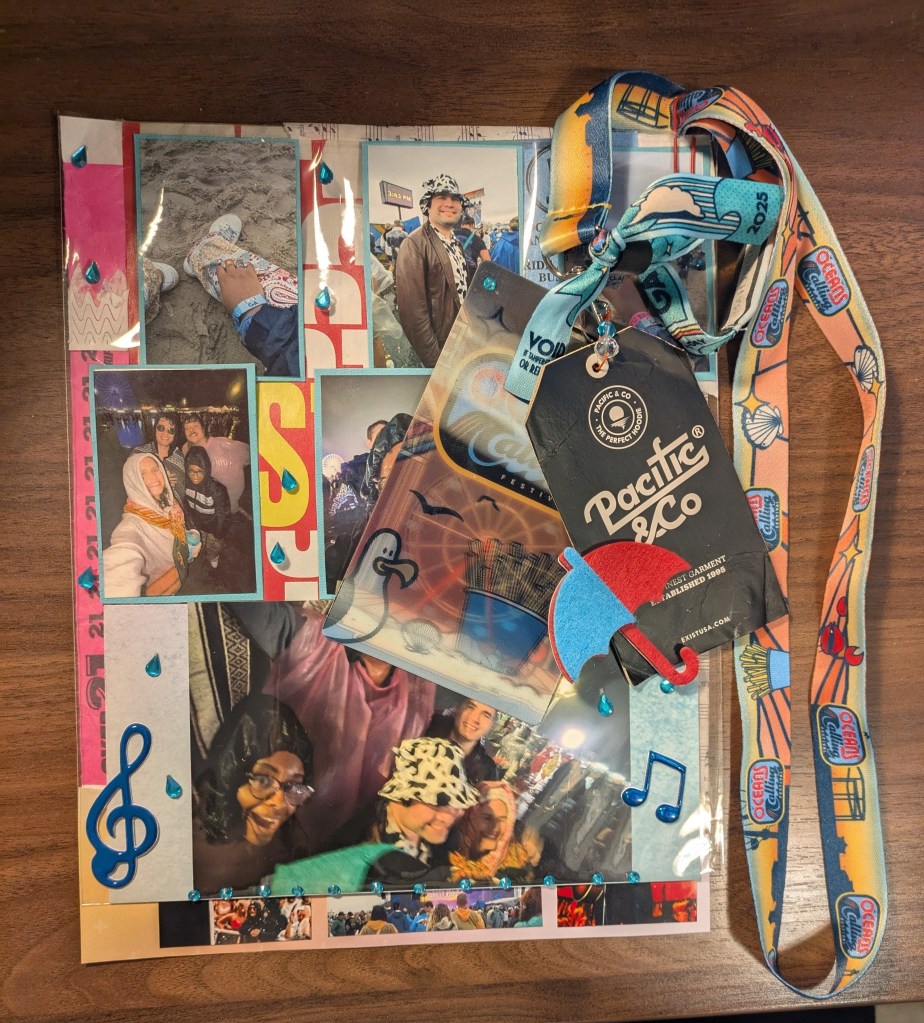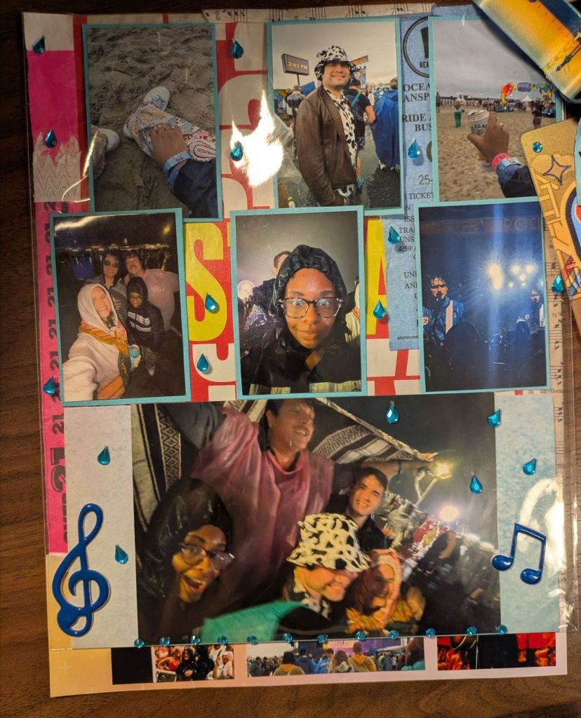 Junk is from the festival (obv), a sweater tag from my future sister-in-law because she was freezing in the cold rain, and a magazine. I put the photos of us in a clear poly bag and added blue water droplet shaped rhinestones on it to look like rain falling on a transparent surface.